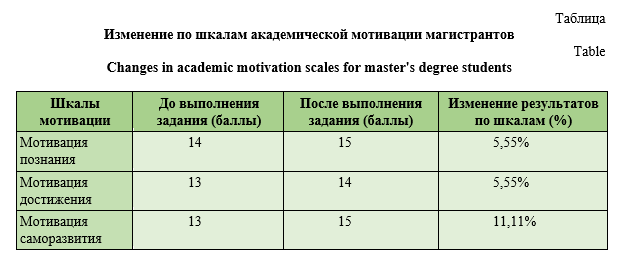 Сравнение изменений средних по выборке респондентов результатов с помощью t-критерия Стьюдента показывает, что различия до и после выполнения задания достоверны при уровне значимости p<0.05 по шкалам мотивации познавательной и достижения, и при уровне значимости p<0.01 по шкале мотивации саморазвития.