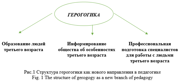 Вообще об образовании в третьем возрасте пишут как о способе сохранения и развития социальной общности пожилых людей (Зборовский, Амбарова, 2019; Татаринов, 2021). Присутствует понимание, что обучение в университетах третьего возраста должно осуществляться с учётом возрастных особенностей обучающихся (Андриенко, 2020; Звягинцев, 2011; Ермак, 2011). Здесь возникает понятие герогогики – это относительно новый термин, буквально означающий «наука о воспитании людей пожилого и старческого возраста». Исходя из данного определения, в герогогике можно выделить три основных раздела (рис.1): собственно образование пожилых, обучение окружающих взаимодействию с пожилыми, и профессиональная подготовка специалистов для работы с людьми пожилого и старческого возраста.; профессиональная подготовка специалистов в области геронтологии и гериатрии (Ивашкевич, 2024; Резер, 2021; Маланов и др, 2020).