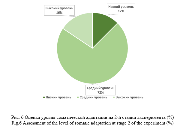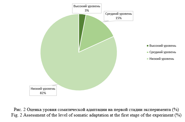 Научные результаты и дискуссия (Research Results and Discussion). Опросник «Шкала оценки соматической адаптации» на 1 этапе эксперимента показал, что все участники эксперимента отметили низкий уровень соматического здоровья. 27 испытуемых из 33 оценили своё соматическое состояние негативно, пятеро – средне, один – высоко (рис. 2).
