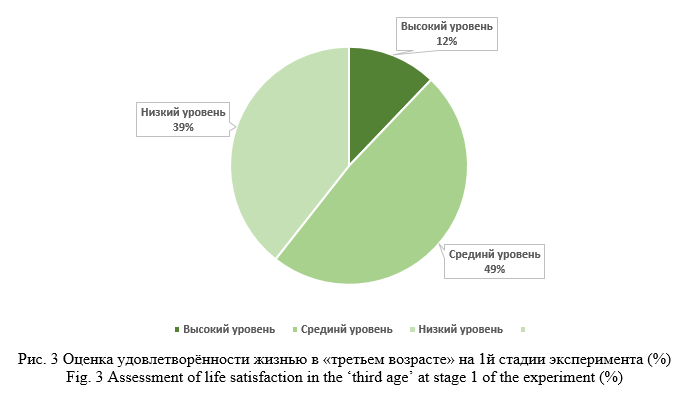 Также в положительную сторону изменилась оценка участниками эксперимента своей удовлетворённости жизнью в третьем возрасте. Показатель низкой удовлетворённости на первом этапе был 39% от общего числа ответов, а на втором – только 21% участников сохранил негативную оценку. Средний уровень удовлетворённости продемонстрировали 49% опрошенных на первом этапе, и 67% − на втором. О высоком уровне удовлетворённости и на первом, и на втором этапе эксперимента заявили 12% участников, т.е. результат не изменился.