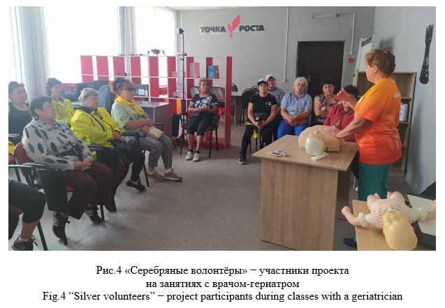 12 семинаров-тренингов «Серебряные волонтеры», образовательные тренинги «Когнитивное здоровье» с рекомендациями по профилактике когнитивных заболеваний. Участники семинаров изучили способы тренировки памяти, комплекс кинезиологических упражнений, пальчиковую гимнастику. Применялась вокалотерапия, арттерапия, танцедвигательная терапия и другие виды физической активности. Беседы врача-гериатра имели целью не только рассказать о проблемах физического и когнитивного здоровья «третьего возраста», но дополнялись рекомендациями о профилактике и раннем диагностировании заболеваний (рис. 4).