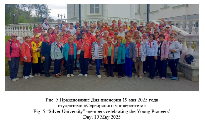 Система образования людей серебряного возраста у нас в стране развивается активно, но не всегда системно. Опыт СССР предлагал открытые лекции в народных университетах, функционировало общество «Знание», была система наставничества. Правительство РФ в 2025 году утвердило стратегию поддержки пожилых людей до 2030 года, что предполагает продление активного долголетия за счёт развитие медицины и социальной помощи, создание возможностей для самореализации пожилых3. Сегодня многое зависит от активной личной позиции самих людей третьего возраста, а также тех, кто берёт на себя организацию этой системы. Нужно отметить работу отделений Союза пенсионеров России, которые в рамках общероссийской программы «Активное долголетие» начали выстраивать в регионах систему работы с людьми третьего возраста4.