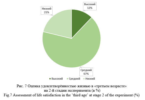 Опросник «Удовлетворенность жизнью в «третьем возрасте» после завершения формирующего эксперимента продемонстрировал следующие результаты. Из 33 испытуемых большинство оценили свой показатель удовлетворённости жизнью в «третьем возрасте» как средний (22 участника). Семь – как низкий. По-прежнему лишь четыре участника вновь оценили удовлетворённость жизнью высоко, т.е. по этому показателю результат не изменился. Графически результаты диагностики представлены на рис. 7.