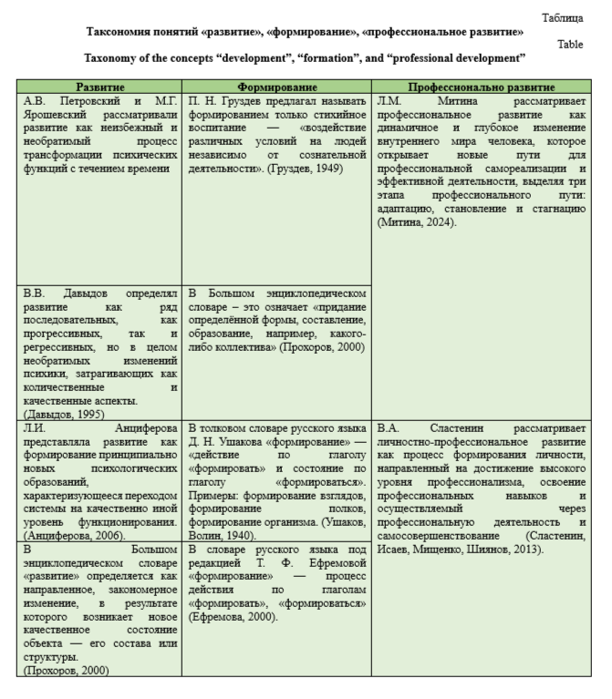 Научные результаты и дискуссия (Research Results and Discussion). Для определения понятия формирующего профессионального развития обратимся к содержанию входящих в него понятий «развитие», «формирование», «профессиональное развитие». Соотнесение содержания обозначенных понятий представлено в таблице.