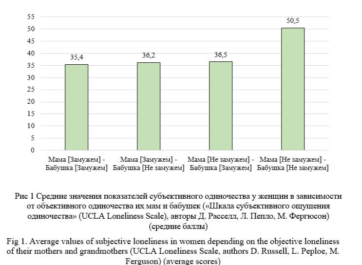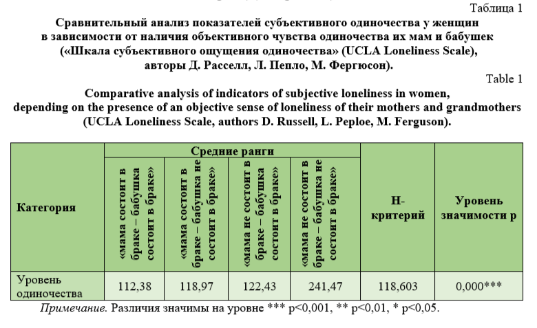Результаты исследования и их обсуждение (Research Results and Discussion). Первоначально рассмотрим наличие/отсутствие различий в показателях субъективного одиночества у женщин в контексте зависимости от наличия объективного чувства одиночества их мам и бабушек (т.е. мамы и бабушки респондентов не замужем).