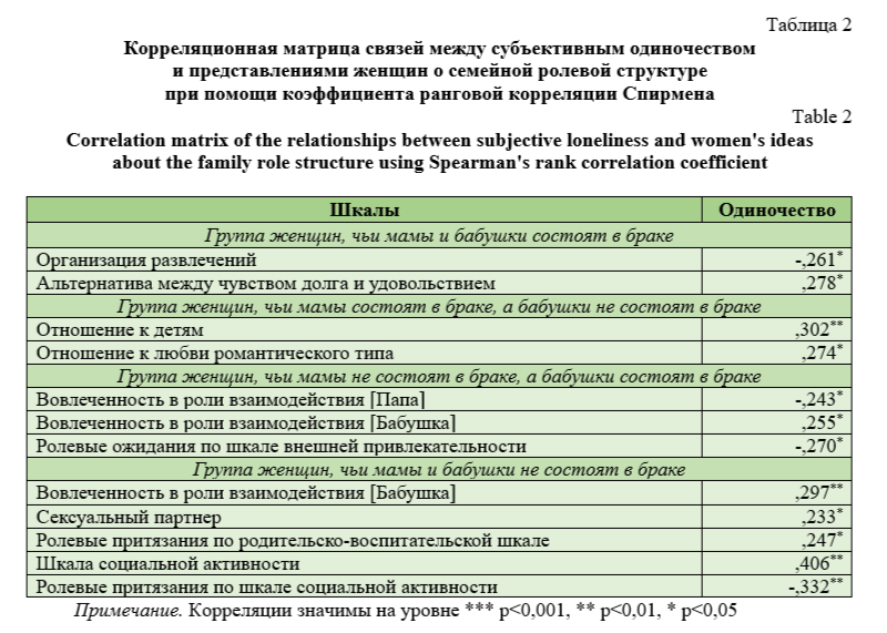 С целью определения особенностей взаимосвязи между переживанием субъективного одиночества и представлениями женщин о семейной ролевой структуре с учётом ощущения объективного одиночества мам и бабушек респондентов был проведен корреляционный анализ с применением коэффициента ранговой корреляции Спирмена.