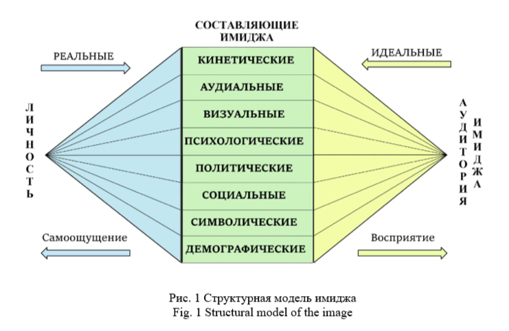 Авторами статьи разработана структурная модель имиджа, которая отражает двойственный характер имиджа: с ориентацией на личность (на самоощущение) и/или ориентацией на аудиторию имиджа (на восприятие). Имидж может включать в себя реальные характеристики личности или только те качества, которые интересны аудитории имиджа (идеальные характеристики). Данный подход позволяет разрабатывать стратегию по формированию или оптимизации имиджа в зависимости от целей субъекта имиджа. На рис. 1 представлена авторская структурная модель имиджа.