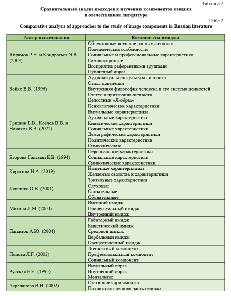 Авторами статьи был проведен сравнительный анализ подходов в отечественной литературе к изучению компонентов имиджа, результаты которого представлены в табл. 2.