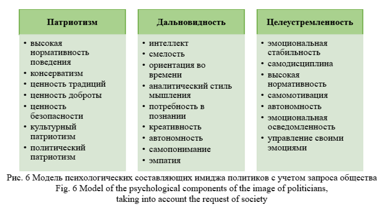 Модель психологических составляющих имиджа политического лидера. Опираясь на современный социальный запрос к личностным качествам политического лидера (патриотизм, дальновидность, целеустремленность) (Карпенко, Павлова, 2024), авторами статьи была разработана модель психологических составляющих имиджа современного политического лидера. Модель представляет собой соотношение качеств, запрашиваемых современным обществом, с индивидуально-психологическими свойствами личности. Индивидуально-психологические свойства представлены шкалами, используемых методик. Результаты представлены на рис. 6.